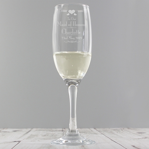 Personalise this Decorative Wedding Maid of Honour Glass Flute with a name up to 12 characters and a date up to 15 characters.'To Our Maid of Honour' is fixed text.Hand Wash Only.NOTE: Due to the font type used please refrain from using all capitals in your personalised message. If the message is all in capitals you will find the personalisation extremely difficult to understand and may even result in personalisation being missed off the product. Many thanks for your cooperation.Ideal for Wedding.