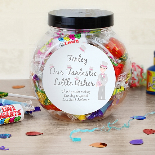Personalise this fabulous usher design with any name up to 12 characters and a message over 3 lines, up to 20 characters per line.Please note. 'Our Fantastic Little Usher' is fixed text.Sweet Jars and Content weigh a total of 250g. Sweet Jar is plastic with black plastic screw top. Sweets are an assortment of Swizzels Matlow sweets. May Contain Nuts. Lollipops are a potential choking hazard. Not suitable for children under 36 months. Ideal for Wedding gifts.