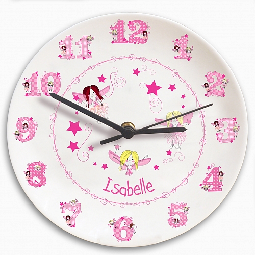 This pretty 'Fairy' themed bone china clock makes a fantastic gift on any occasion. Perfect for Kids!Personalise with any name using up to 12 characters.This plate is 8 inches.Battery not included, requires 1 AA battery.