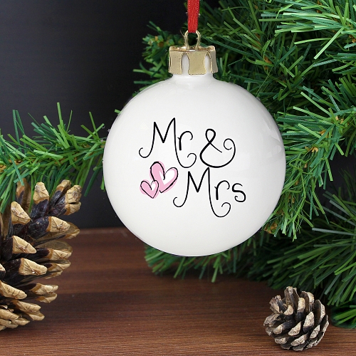 This beautiful ceramic bauble makes the perfect gift for any newlyweds you may know. 'Mr & Mrs' is standard but you can personalise the reverse with any message over 4 lines, 20 per line. The style of bauble topper may vary.